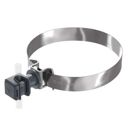 Універсальний хомут з Clip призначений для кріплення дроту або струмопровідної смуги до водостічних труб діаметром від 60 до 120 мм. Завдяки регульованій конструкції підходить до більшості типів труб — круглих і овальних, незалежно від матеріалу. Виготовлений із сталі гарячого цинкування та харчової нержавіючої сталі, що забезпечує високу корозійну стійкість і довговічність. Монтаж швидкий та зручний, без потреби у спеціальних інструментах.