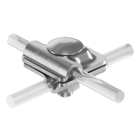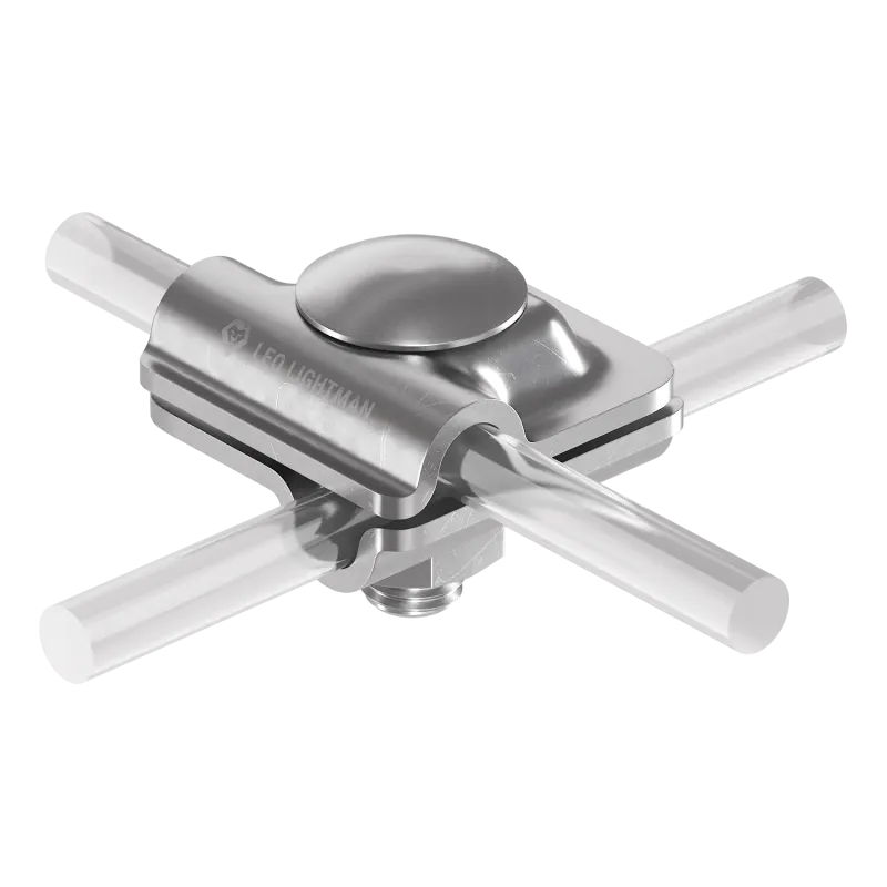 Універсальний з'єднувач для хрестового, паралельного або Т-подібного з’єднання дроту Ø8–10 мм у нержавіючих та мідних системах блискавкозахисту та заземлення. Забезпечує міцне, стабільне та корозійностійке з’єднання.