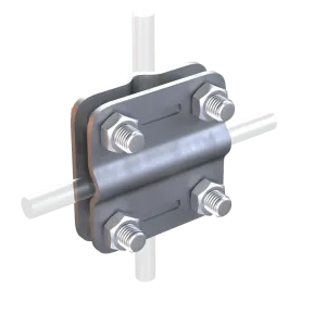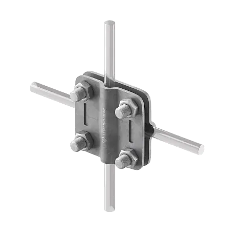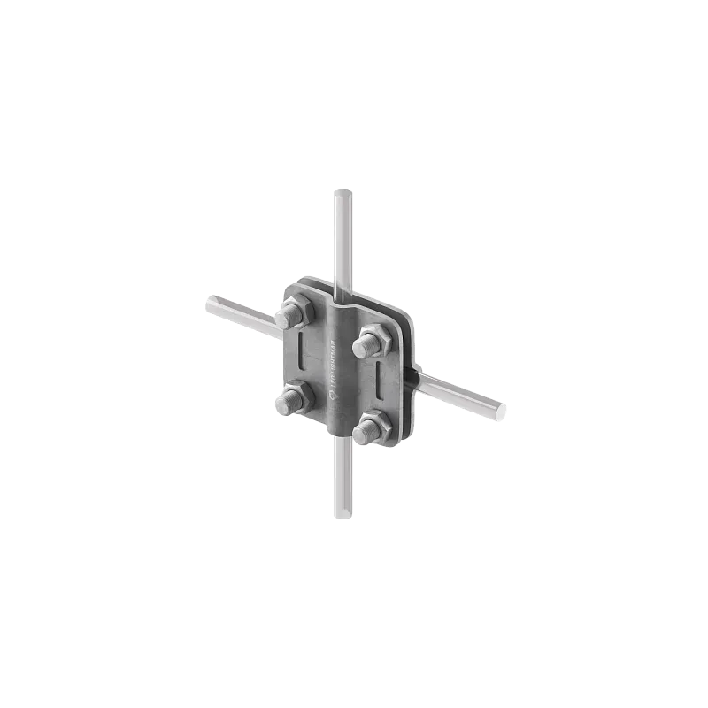 Призначений для хрестового з’єднання круглих провідників діаметром 8–10 мм у системах блискавкозахисту та заземлення. Конструкція з двох пластин забезпечує міцну фіксацію з’єднання, що витримує тривалі навантаження та корозійні впливи.