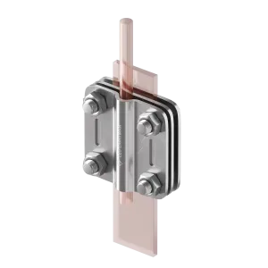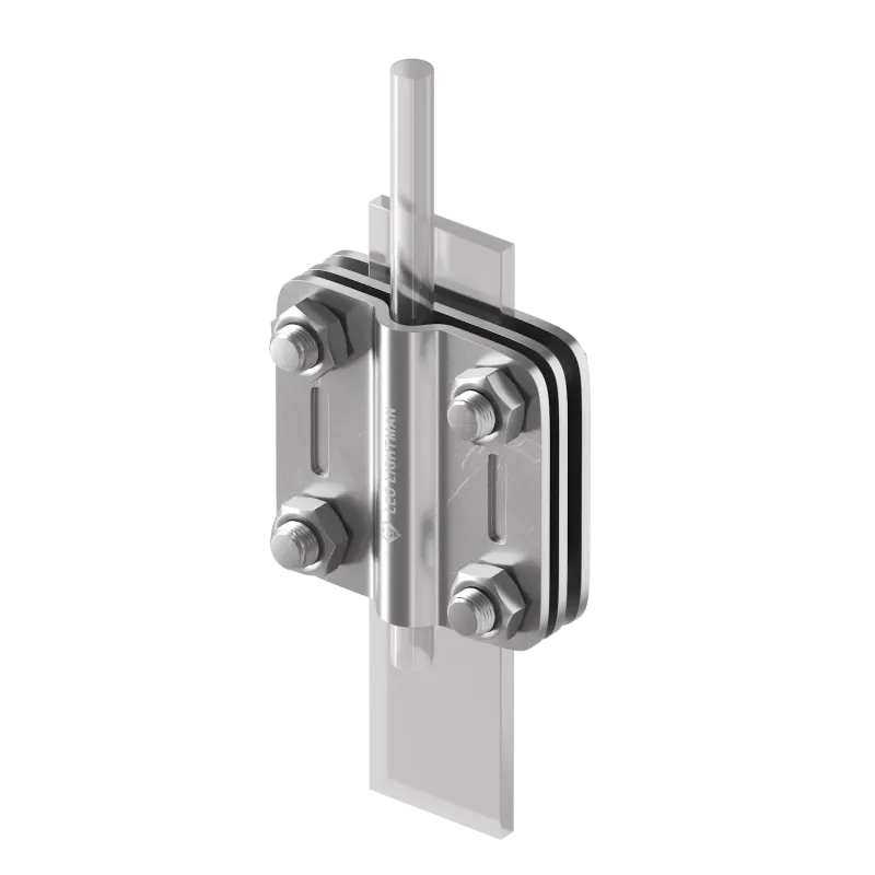 Призначений для хрестового з’єднання круглих і пласких провідників діаметром 8–10 мм у системах блискавкозахисту та заземлення. Конструкція з трьох пластин забезпечує міцну фіксацію з’єднання, що витримує тривалі навантаження та корозійні впливи.